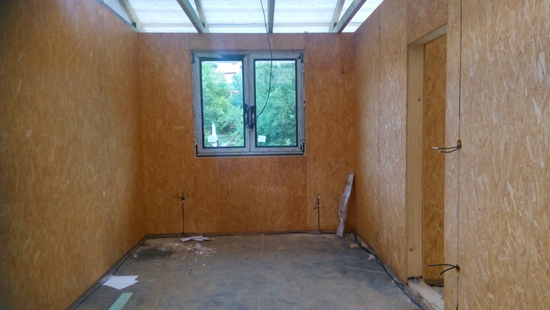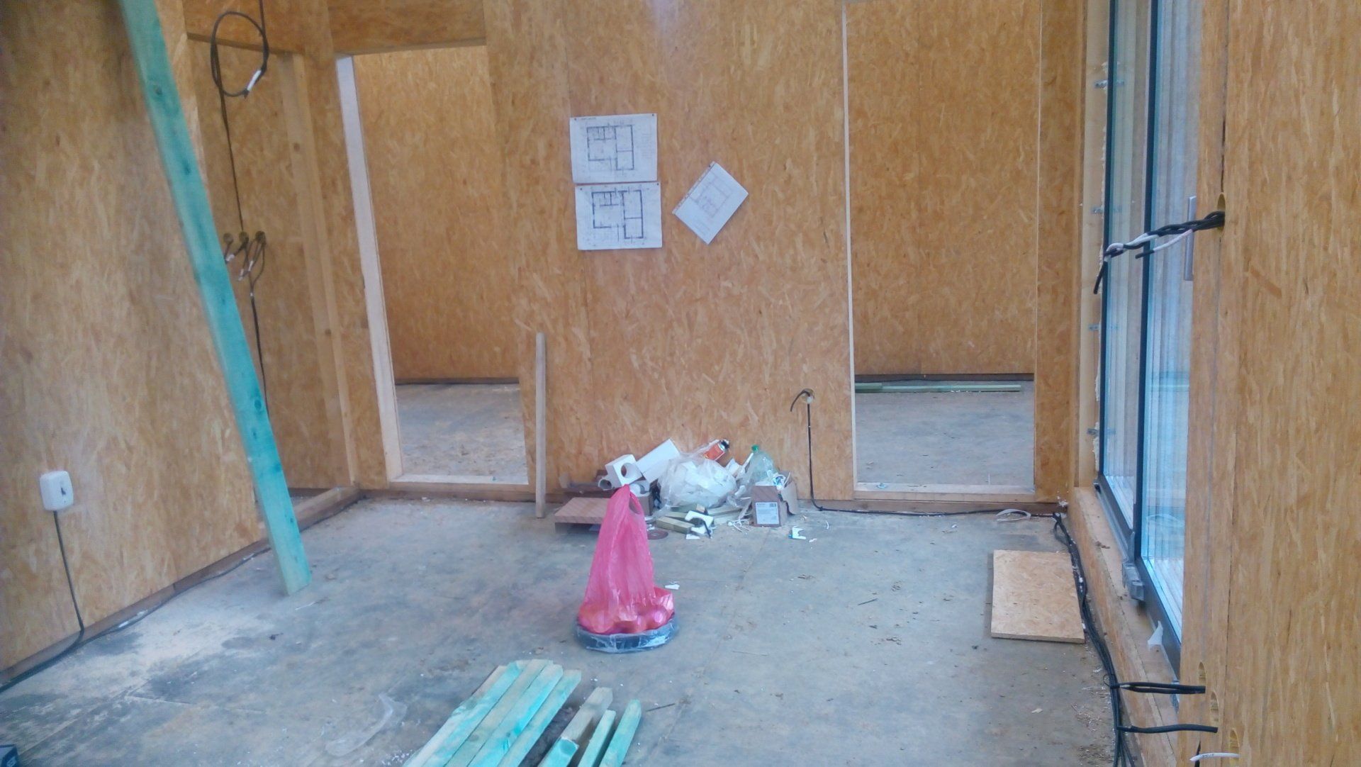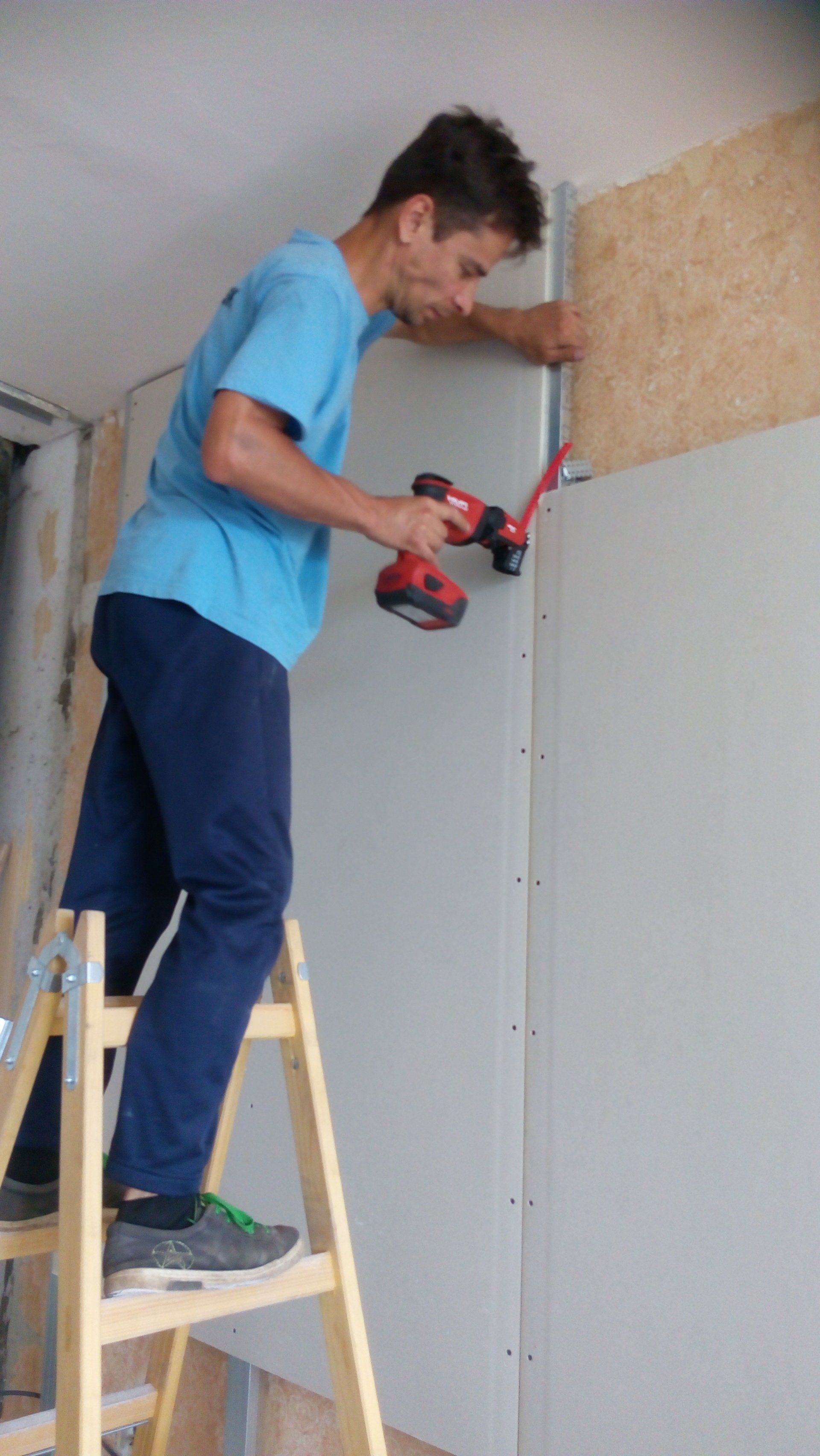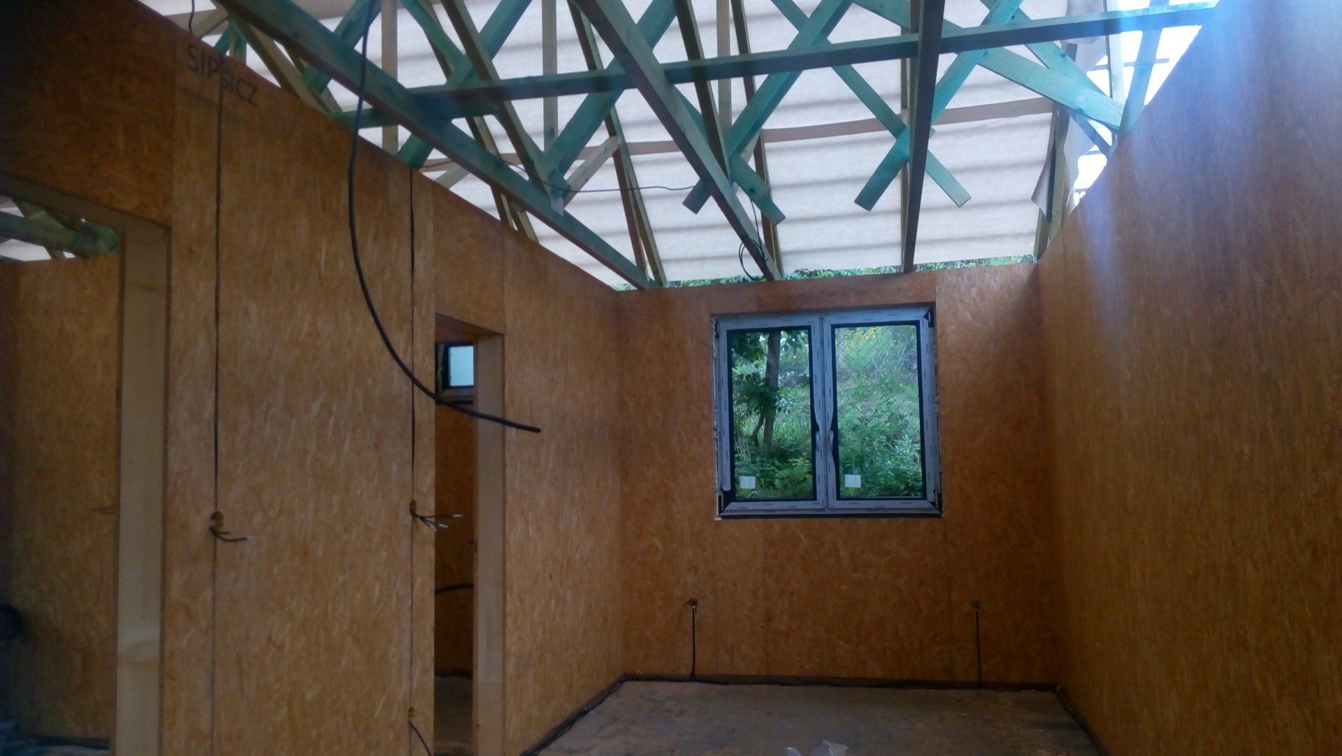 Prebiehala hrubá montáž, drážkovanie a vyružovanie otvorov pre zásuvky a vypínače do dreva - OSB dosky.